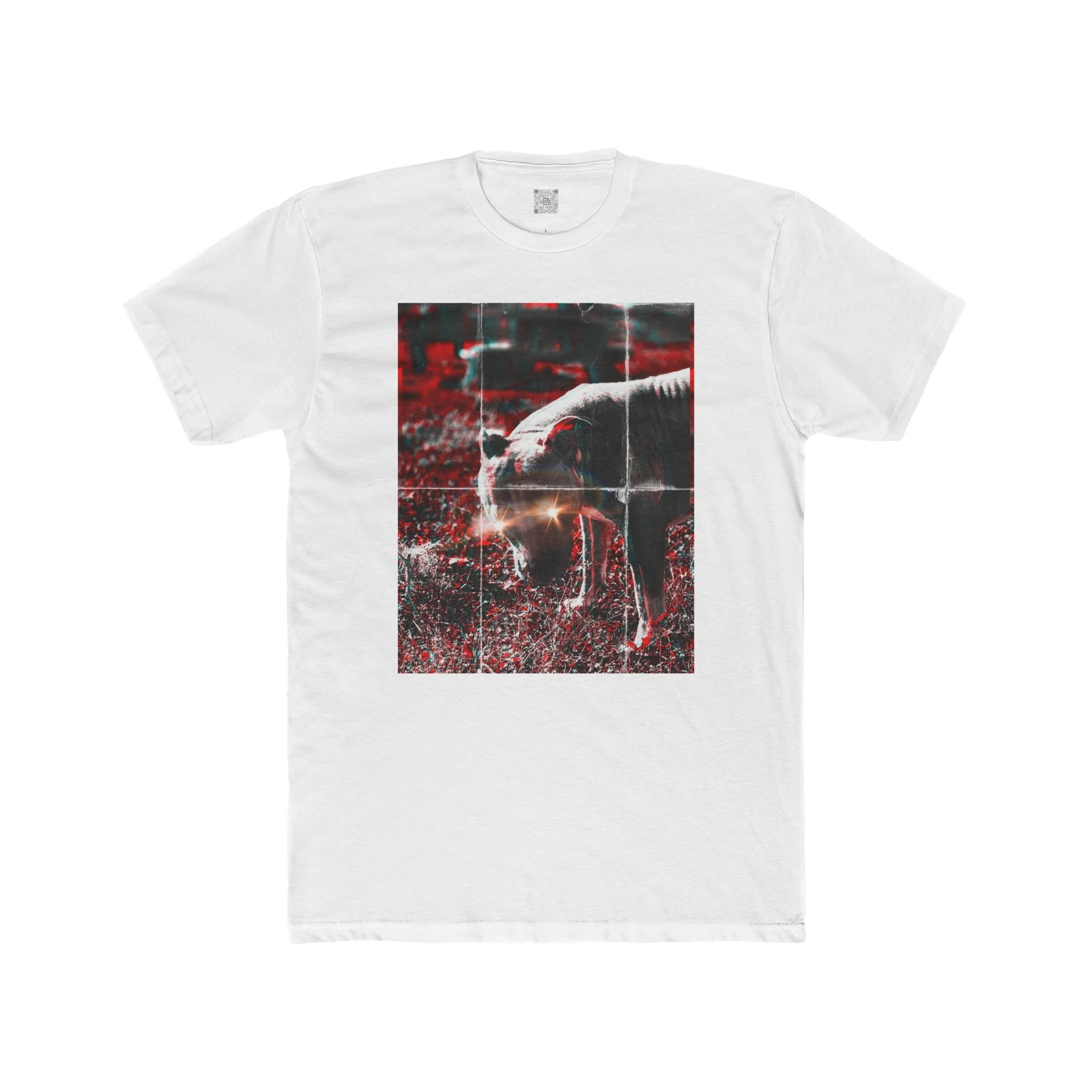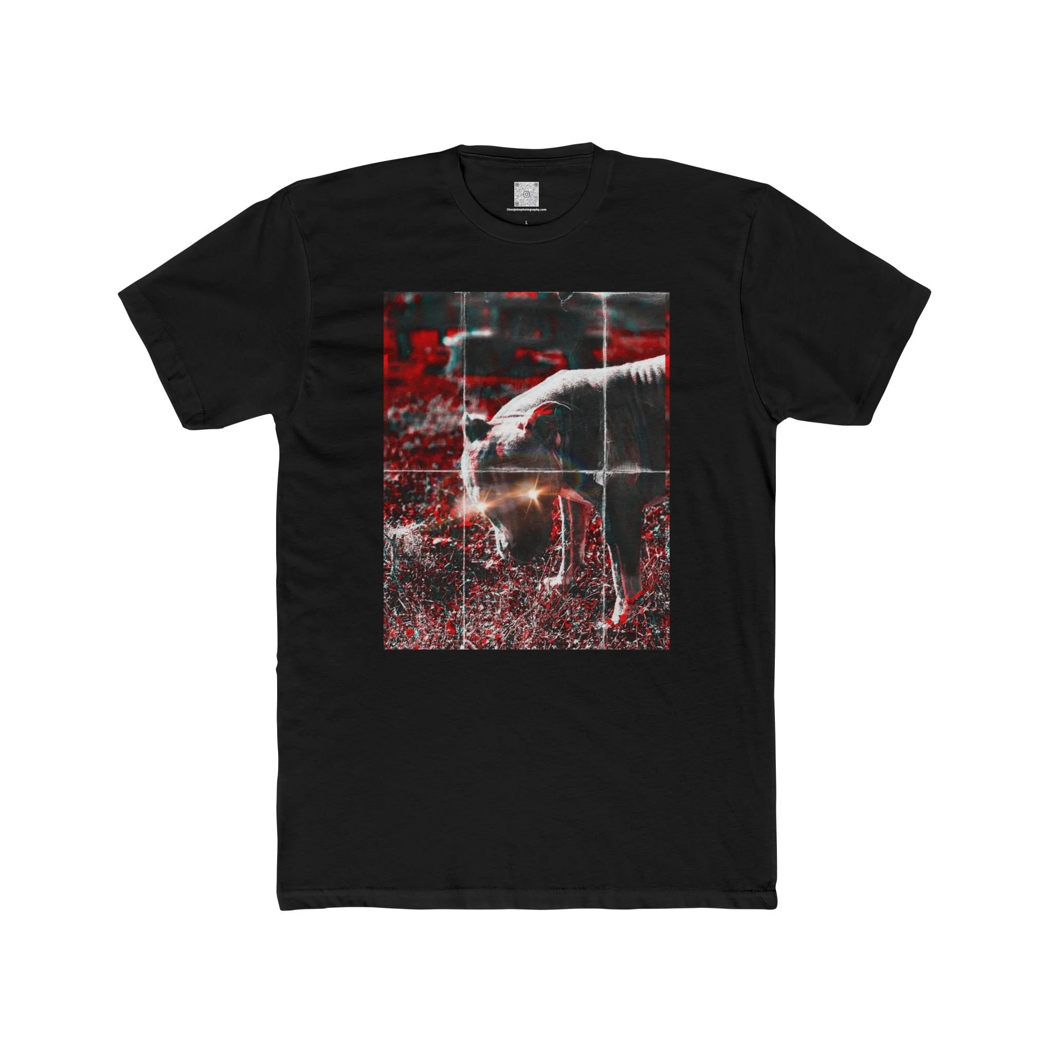 A soft, lightweight cotton crew tee that carries a quietly bold vibe. The front artwork—an atmospheric, high-contrast photograph of a grazing horse set against deep red and moody tones—brings a contemplative, slightly cinematic energy to everyday wear. The classic crew neckline and clean silhouette make it easy to layer under jackets or wear alone while the subtle sleeve print adds an artful, handcrafted touch. Wear it on walks through open fields, to small gallery nights, or when you want a wearable image that feels like a private memory shared out loud.