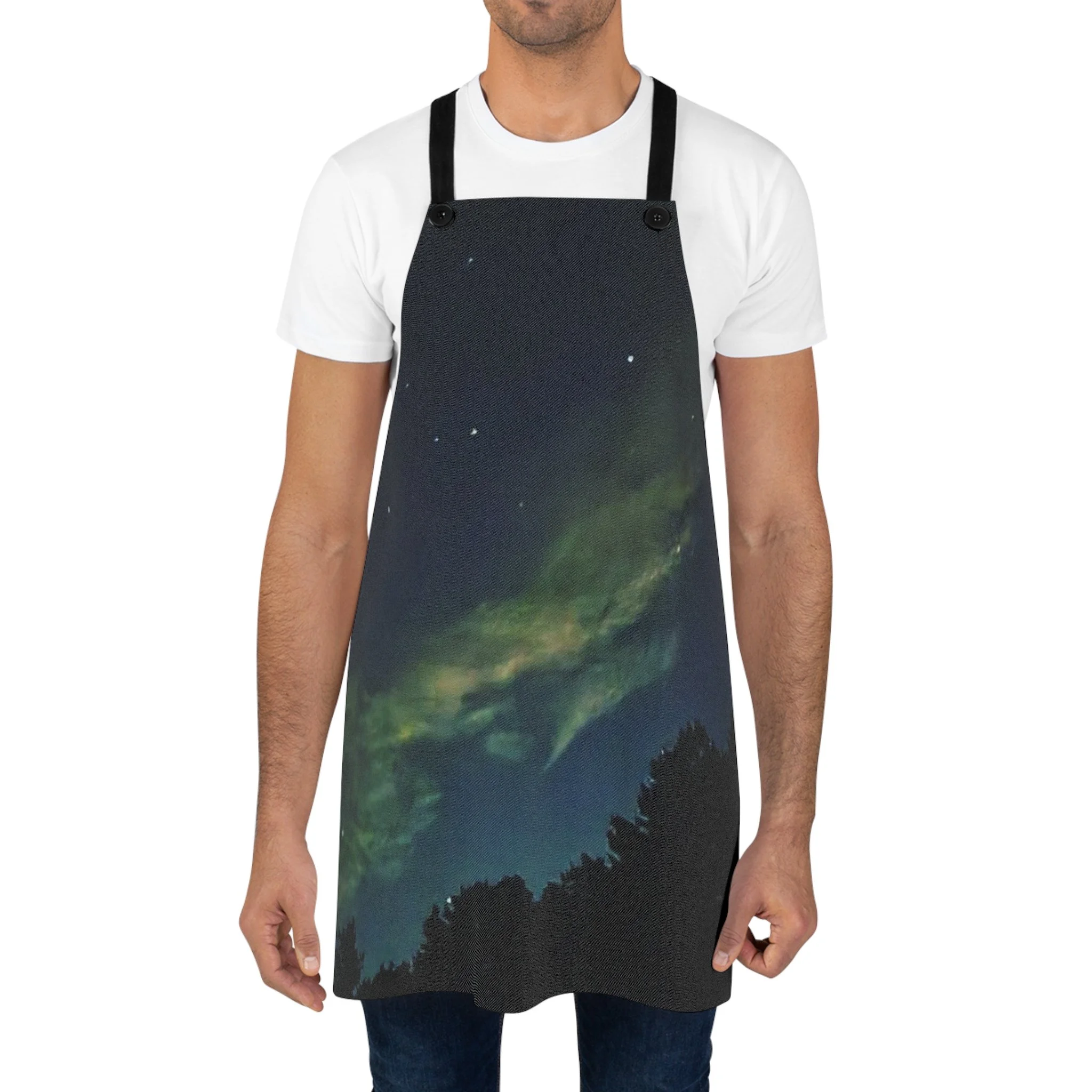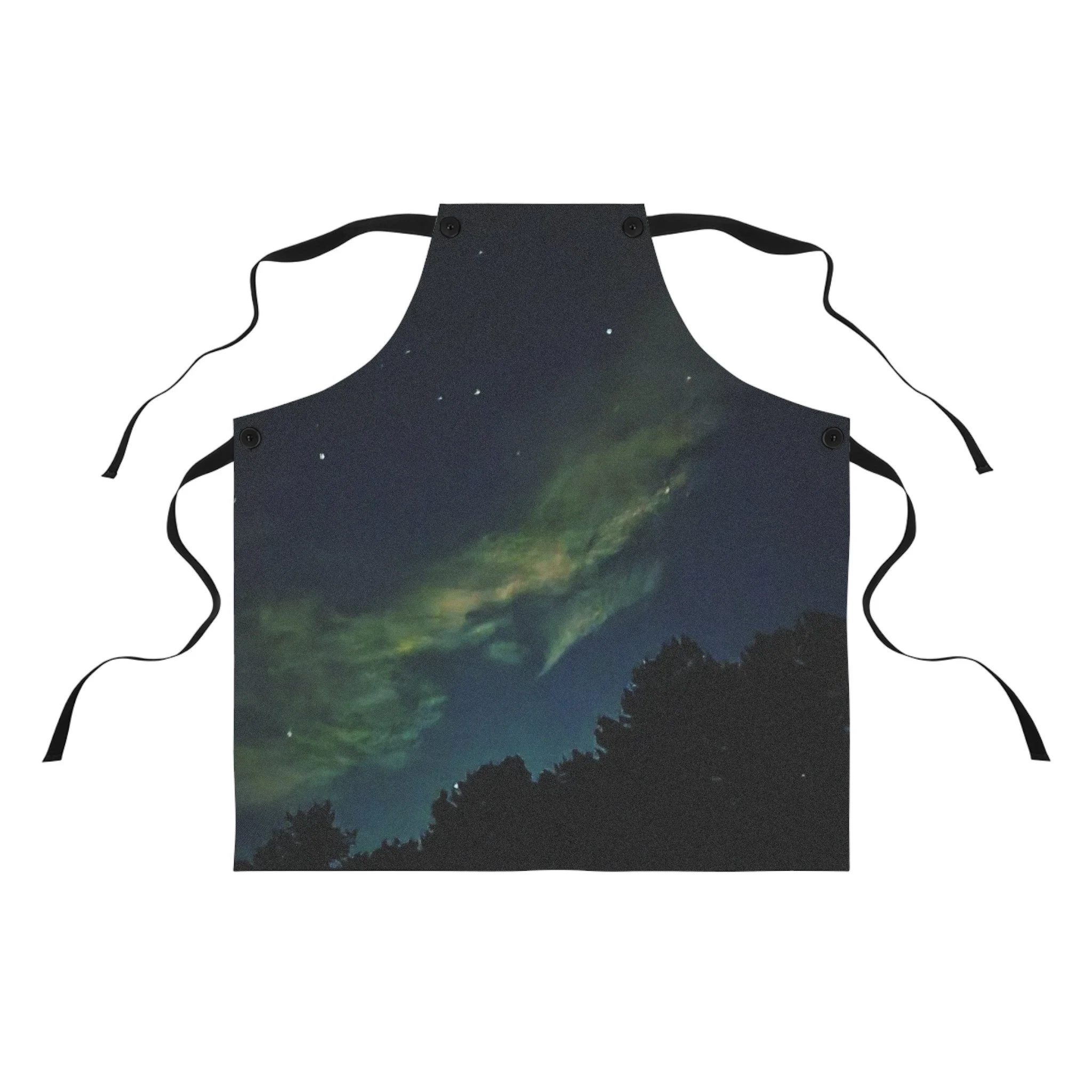Soft night air and the hush of distant pines—this apron carries that stillness into your kitchen. A deep, star-speckled canvas blooms with ghostly green aurora swirls above silhouetted treetops. It feels like slow, intentional cooking under the sky: measuring, stirring, tasting. The durable polyester resists spills and dries quickly, while the removable black twill straps let you adjust for comfort or wash easily. Overlocked seams and reinforced buttonhole attachments mean this apron stands up to long nights of baking, campfire prep, or craft projects. Wear it when you want the calm of the outdoors to linger in your hands and on your countertops.