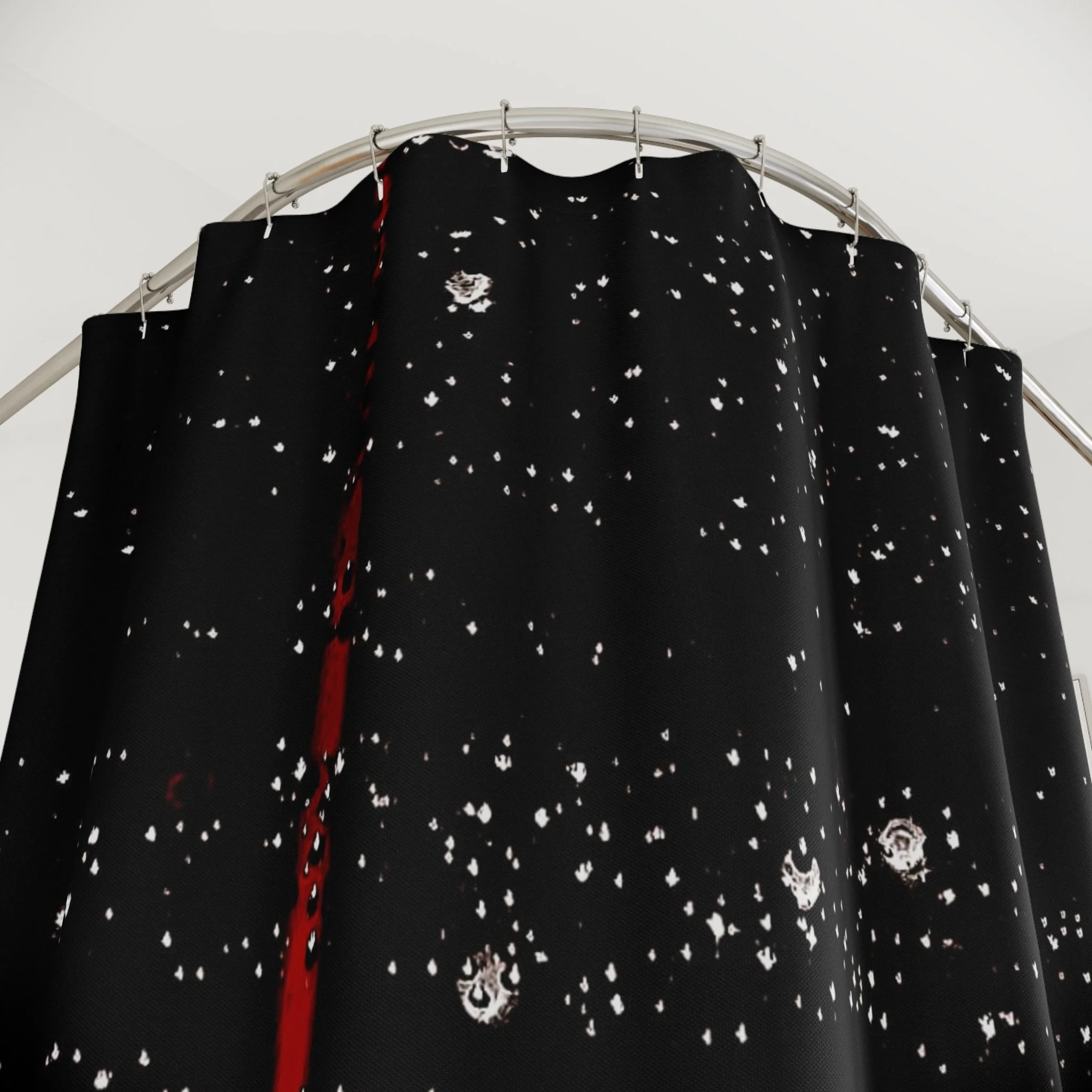 Dripping Mysteries pt. 3 - Galaxy Rain Shower Curtain — Black Space Droplets with Red Accent