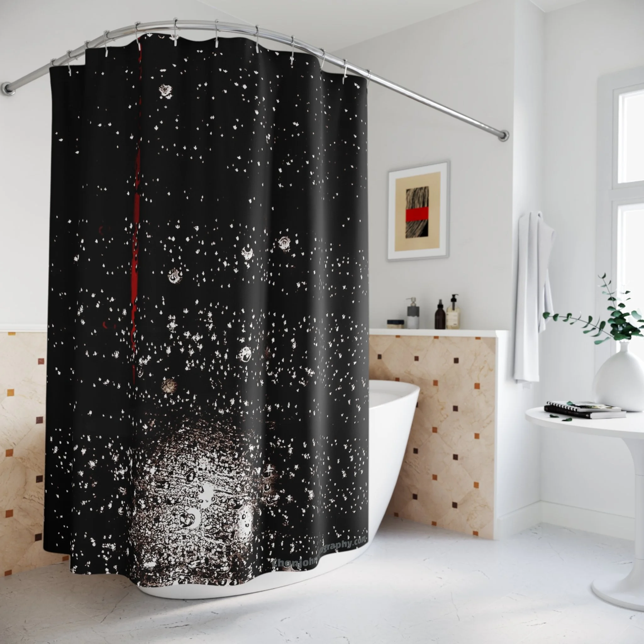 This shower curtain draws the hush of a late-night rain into your bathroom. Deep black fabric is dotted with soft, out-of-focus raindrops and a single streak of crimson running vertically — like a streetlight bleeding through a wet window. The mood is cinematic and intimate. Hang it where you want a little mystery: behind a clawfoot tub, in a moody powder room, or as a dramatic backdrop for a music-inspired loft. The polyester material drapes smoothly, resists wrinkles, and dries fast, so the look stays sharp with everyday use. Buttonholes at the top make installation straightforward (hooks not included).