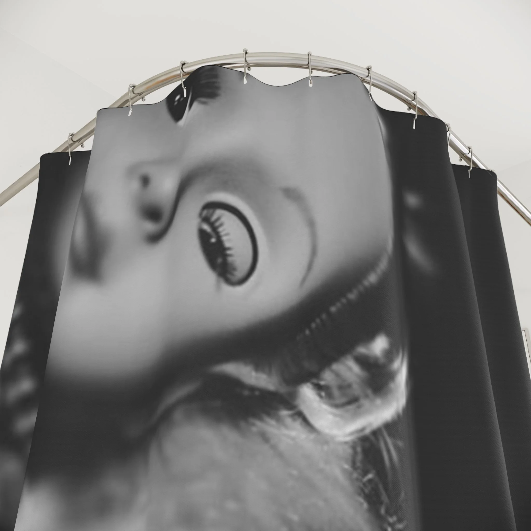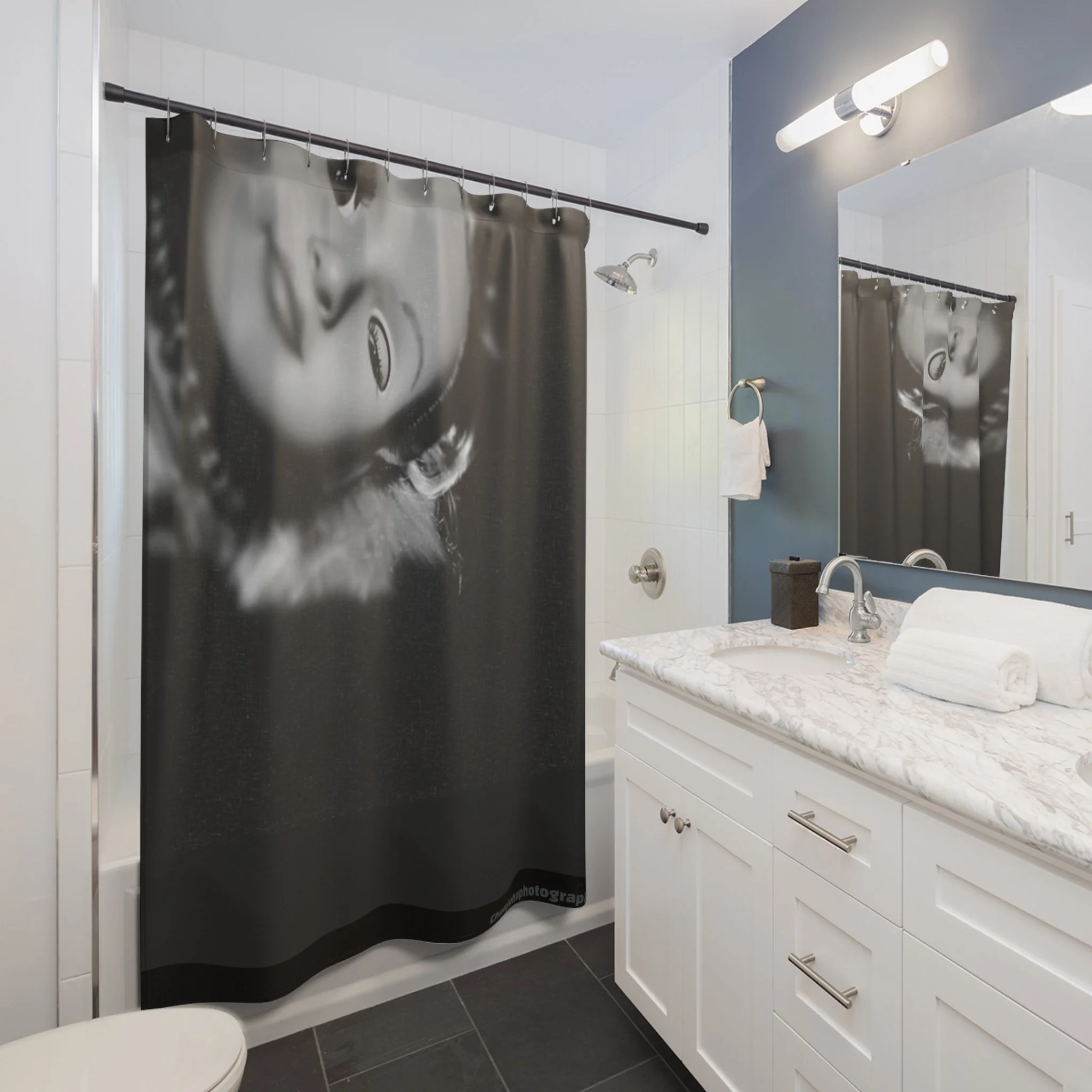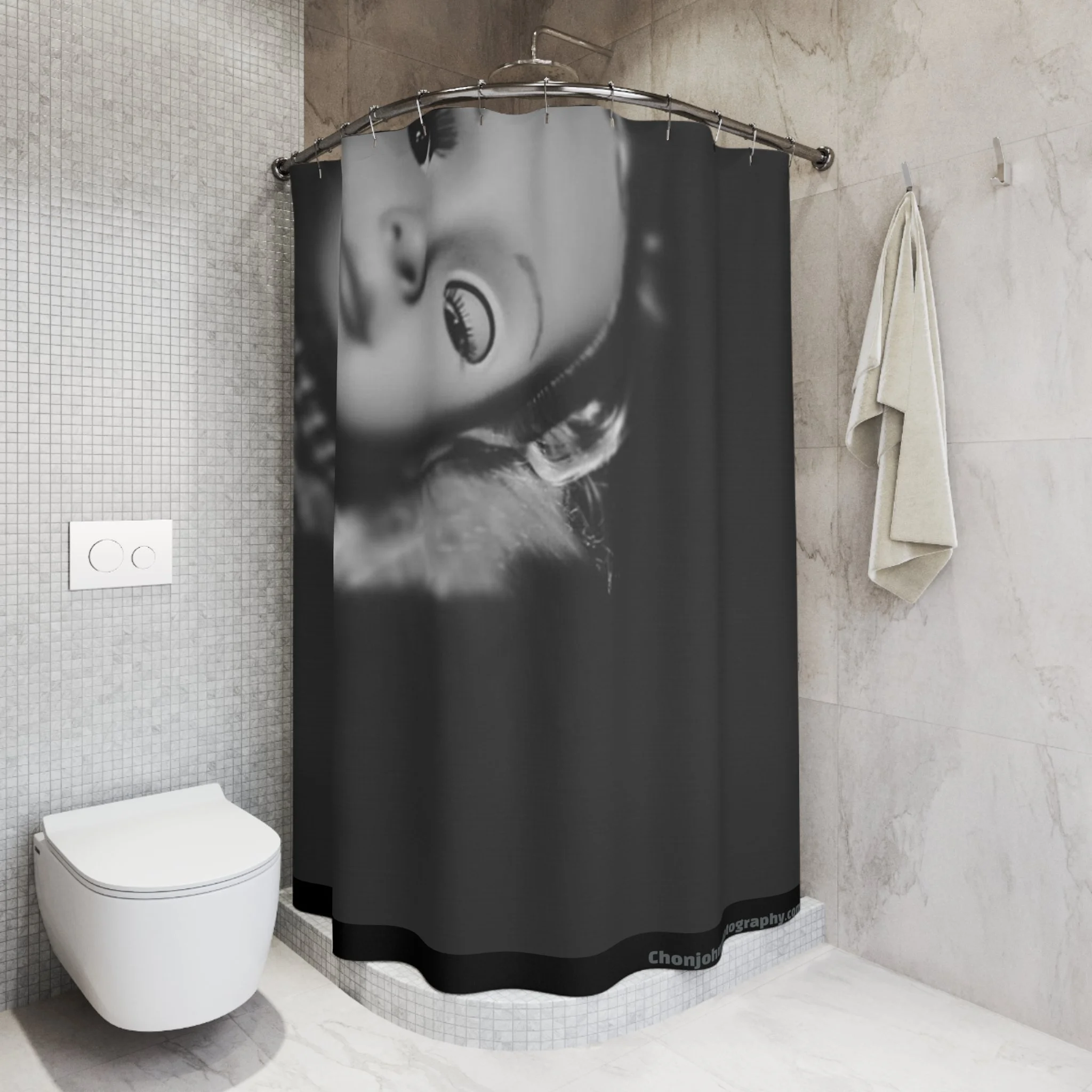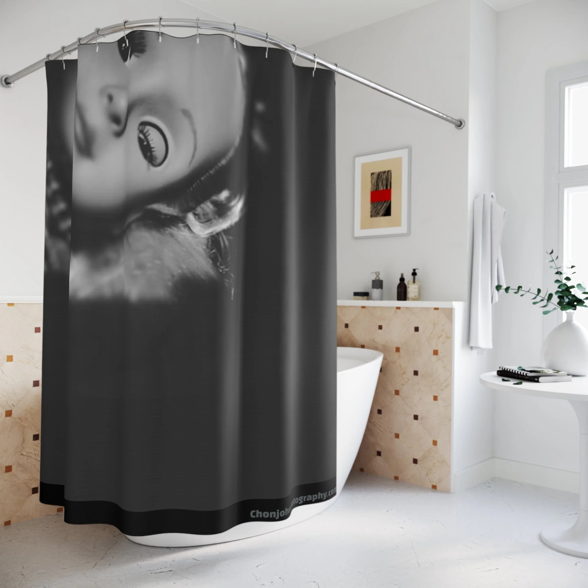 This bold shower curtain transforms a functional space into a statement. The one-sided, high-contrast portrait—rendered in stark black and gray—wraps your stall with a moody, urban photography vibe. Large vertical text along the sides reads like a signature or studio stamp, giving the piece an editorial, gallery-ready feel. The heavy-duty polyester holds its shape and dries quickly, so the graphic stays sharp wash after wash. Twelve reinforced buttonholes make hanging simple (hooks not included). Drop it into a modern bathroom to add attitude and a creative edge that feels like an artist’s studio brought home.