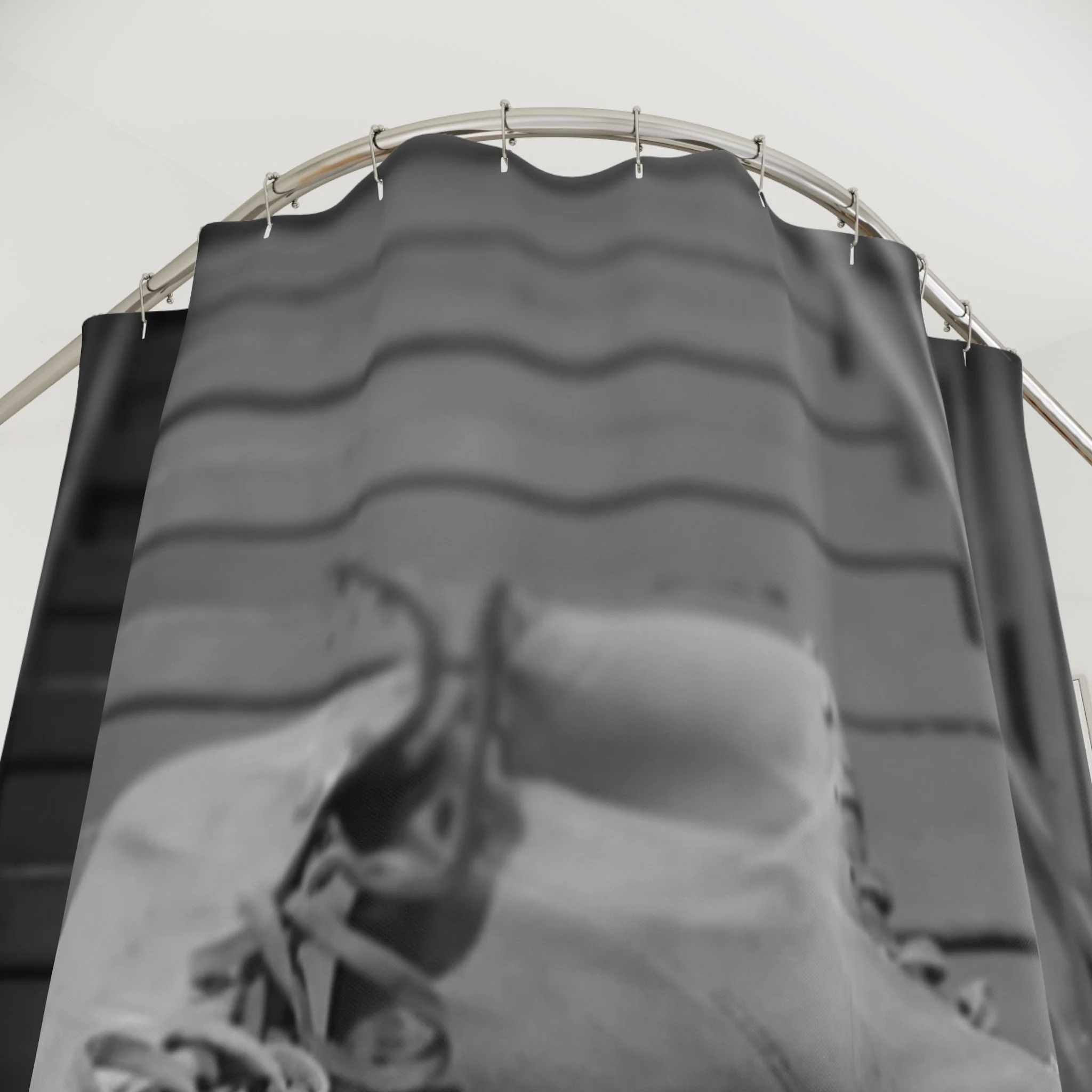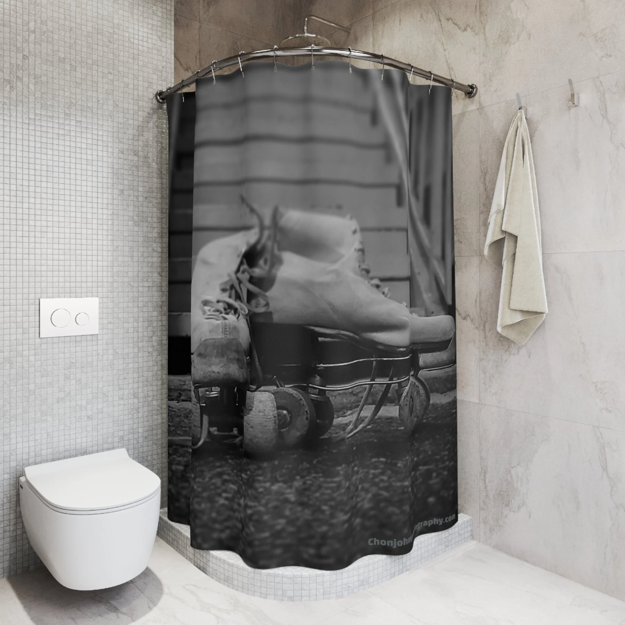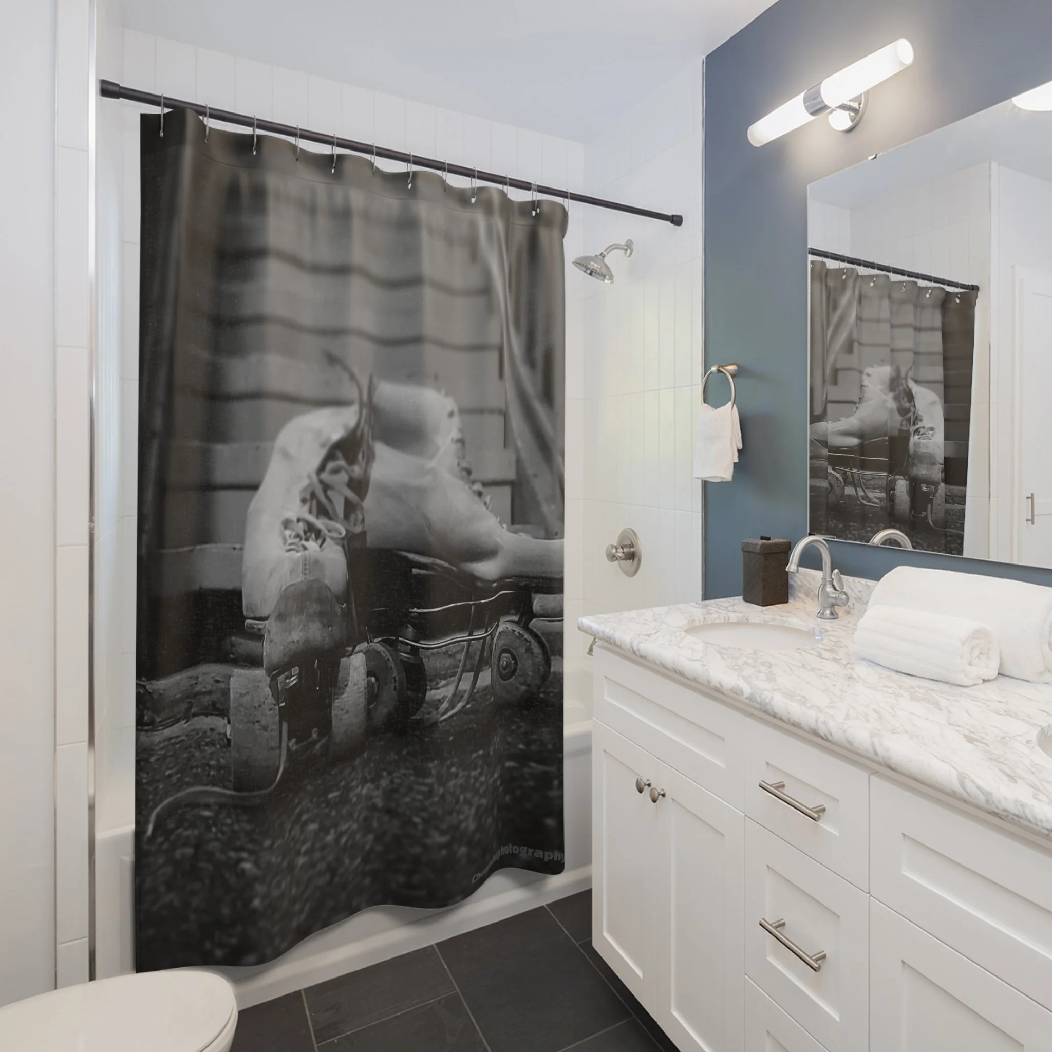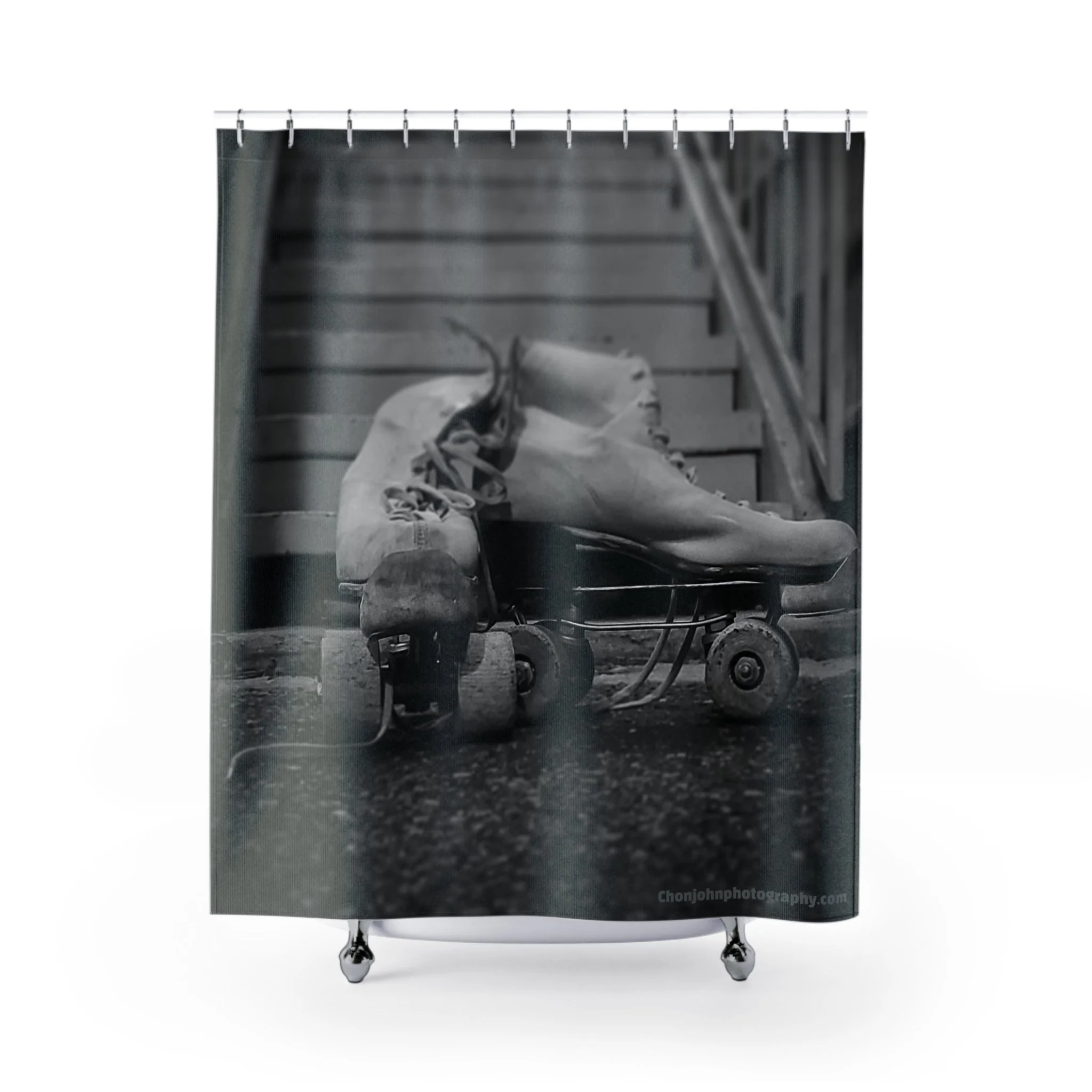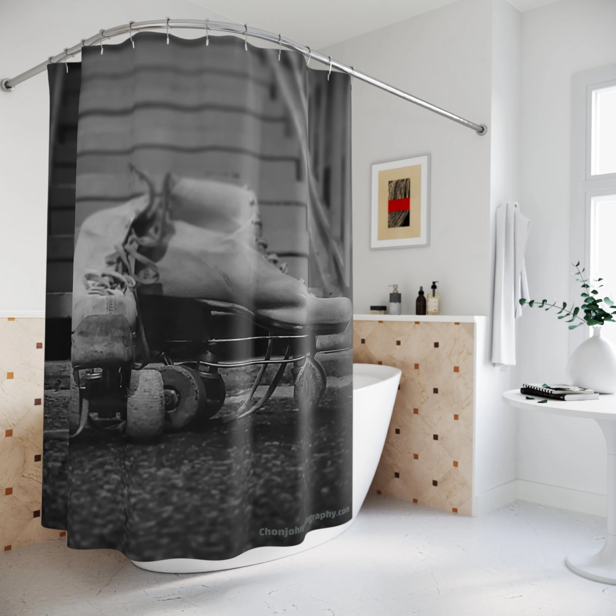 Step into a quiet, nostalgic moment each morning. This shower curtain features a soft-focus black-and-white photograph of well-worn roller skates left at the foot of a porch — a story of slow afternoons, neighborhood steps, and the echo of small adventures. The muted tones bring a calm, vintage atmosphere to the bathroom, where texture and shadow feel like a memory revealed. It hangs with twelve top buttonholes for easy placement and presents the image on one side only, letting the print be the room’s gentle focal point. This curtain suits someone who values lived-in details, understated style, and the kind of decor that prompts a pause — a reminder of simpler rhythms and quiet joy.