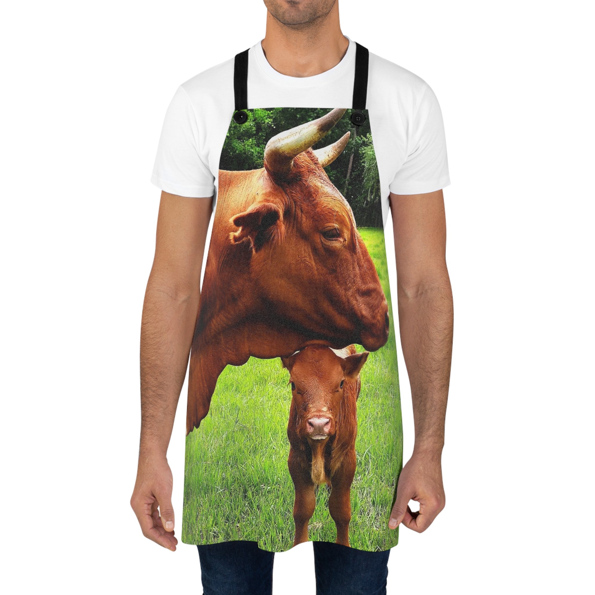 This full-coverage apron carries a warm countryside moment — a close-up of a mother cow nuzzling her calf against a sunlit green pasture. It feels like stepping into a small farm kitchen where the day moves calmly: scent of fresh grass, soft lowing in the distance, hands dusted with flour. Wear it while kneading dough, tending to a backyard smoker, or setting up a farmers’ market table. The sturdy polyester holds its shape through spills and repeated washes; detachable black twill straps let you adjust fit and clean the apron separately. The single-sided, vibrant print keeps the image bold and alive, bringing a touch of rural comfort to everyday cooking and hosting.