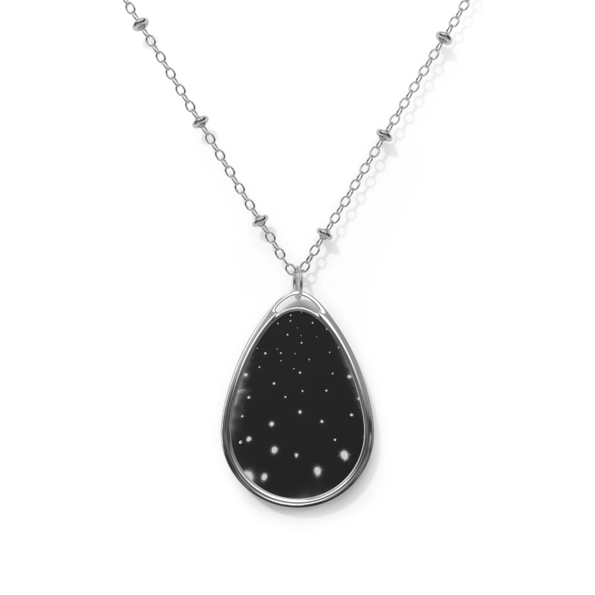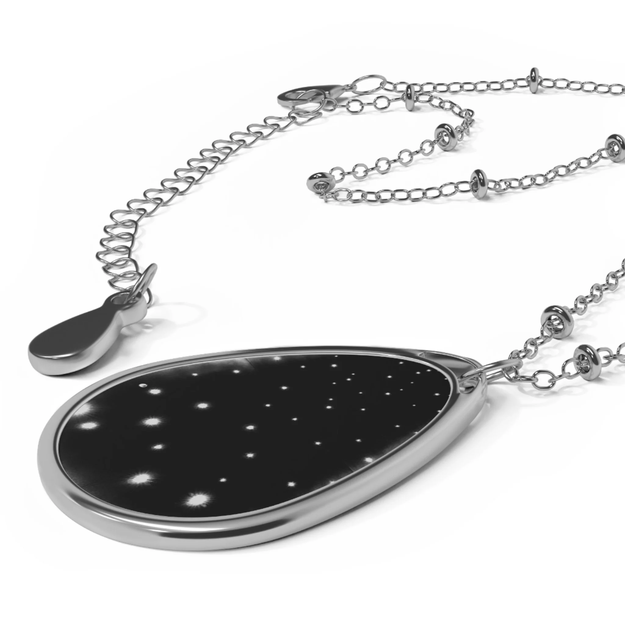 A delicate ellipse pendant necklace that feels like a tiny night sky resting at your collarbone. The glossy, full-color front captures deep blacks and pinpoint stars with vibrant clarity, while the smooth aluminum surface keeps the image crisp over time. The slender chain with small bead details and a secure lobster clasp gives this piece a light, wearable elegance — easy to layer or wear alone on evenings when you want something quietly celestial. It settles into everyday moments and quieter rituals alike, adding a personal, artful touch to outfits and memories.